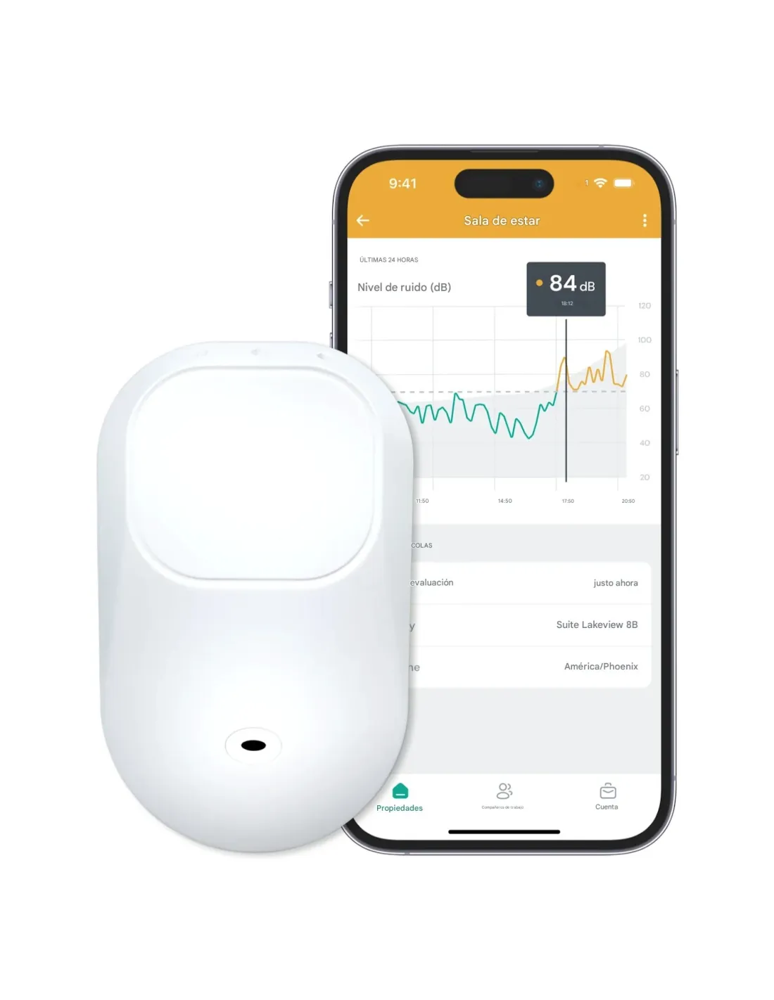 Controlamos los niveles sonoros y le enviamos notificaciones cuando se detecta un ruido excesivo. Puede personalizar los umbrales para el día o la noche. El sistema evita notificaciones innecesarias por ruidos menores.